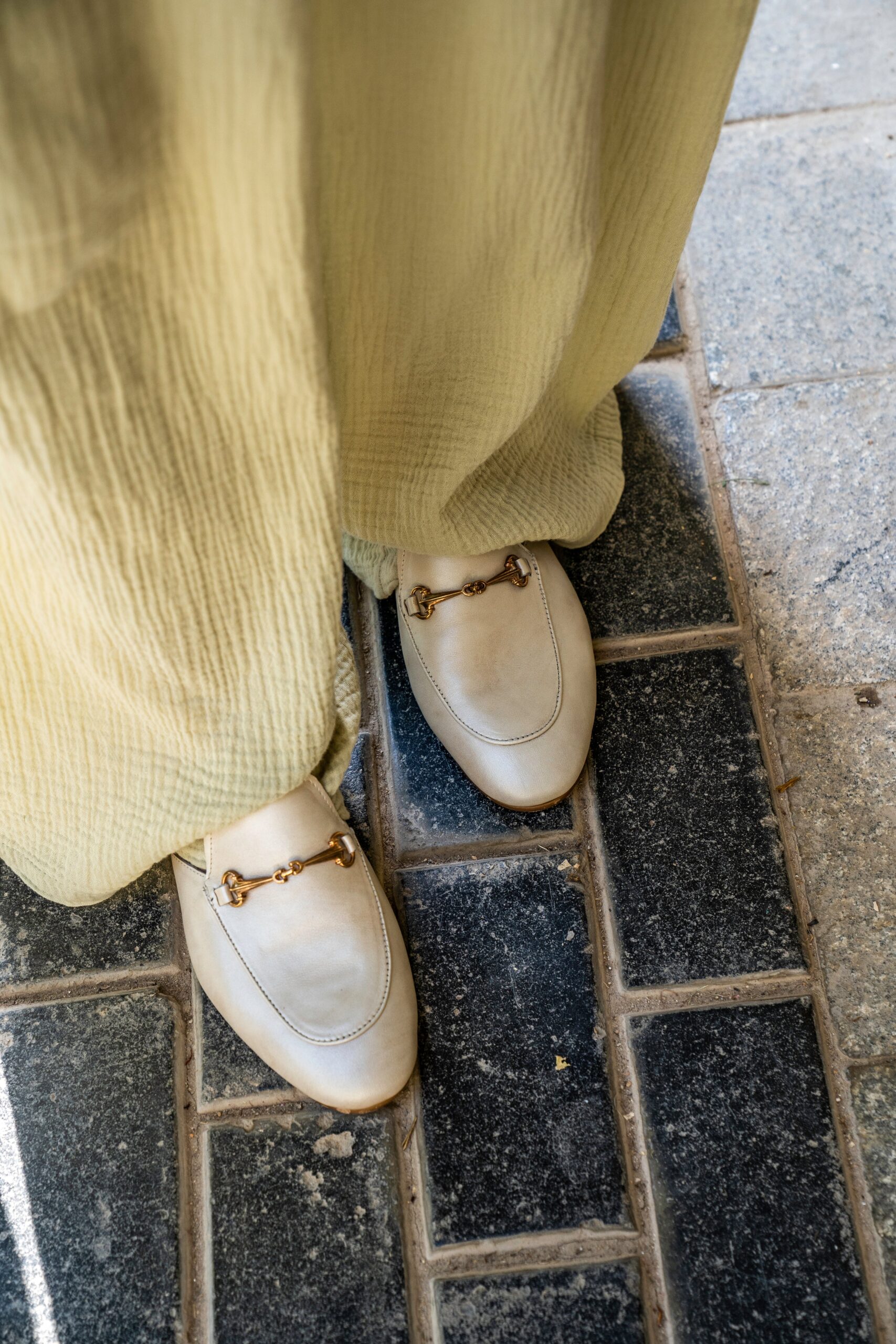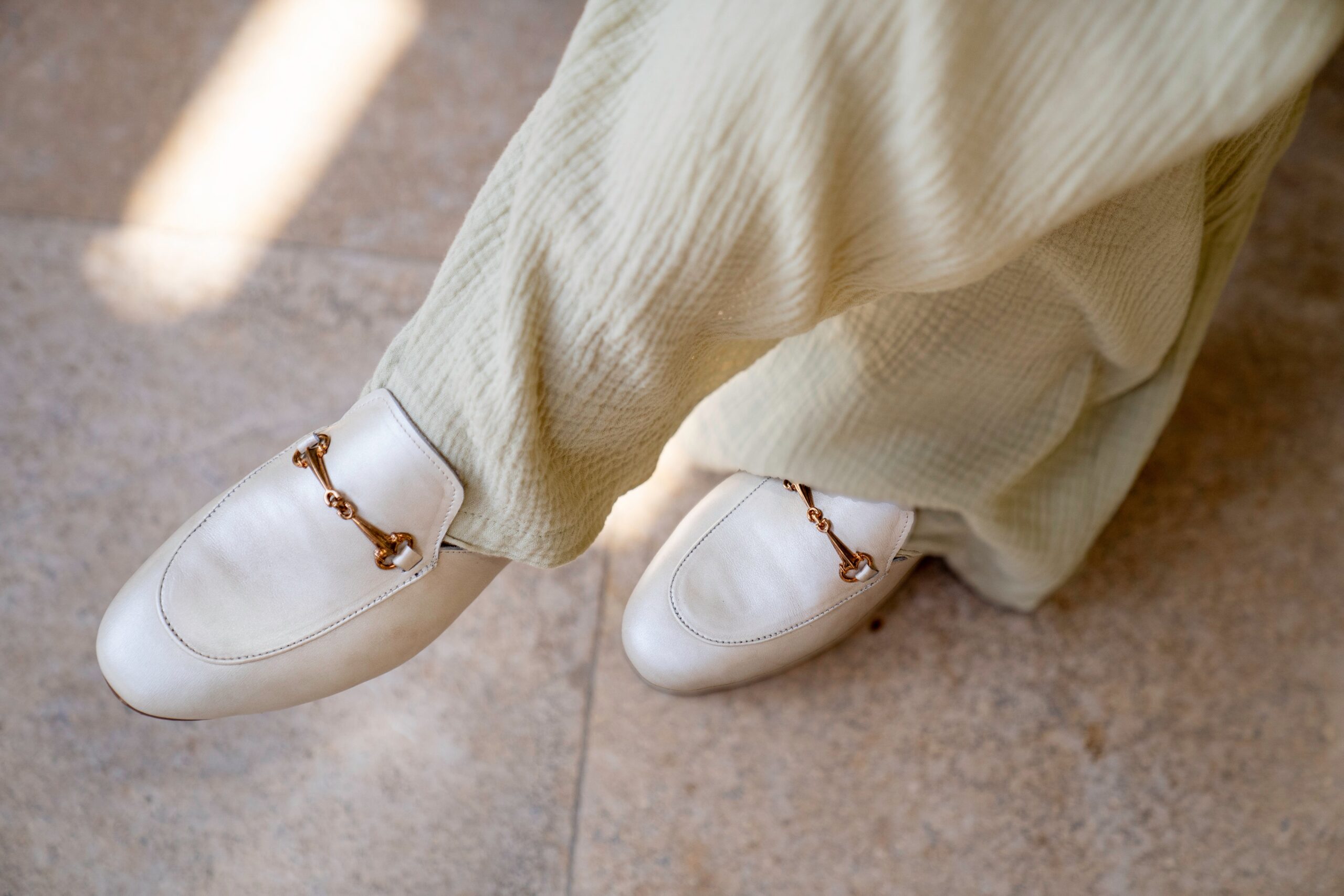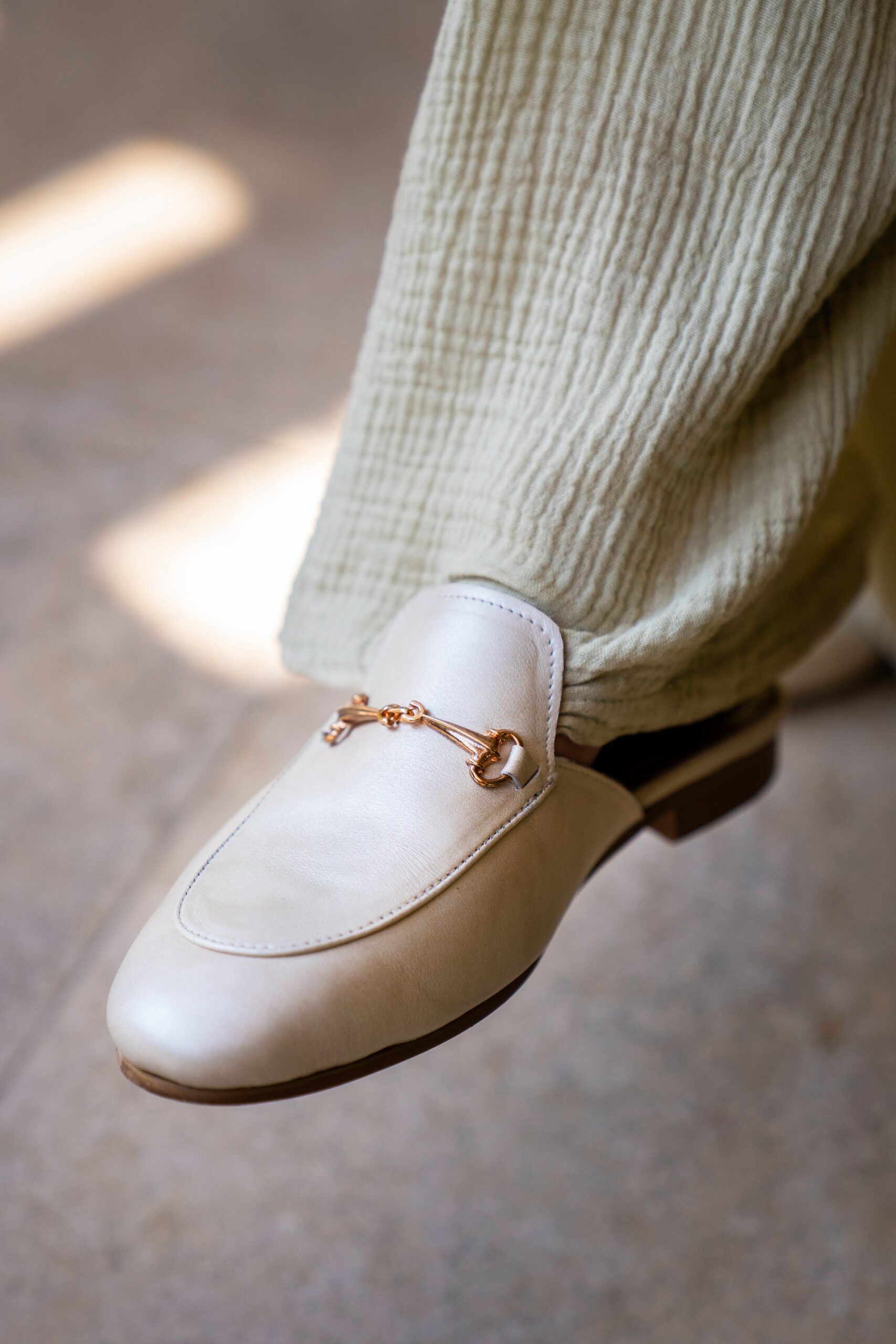The smooth off white leather upper is complemented by a gold-toned horsebit ornament. adding a refined touch of luxury.